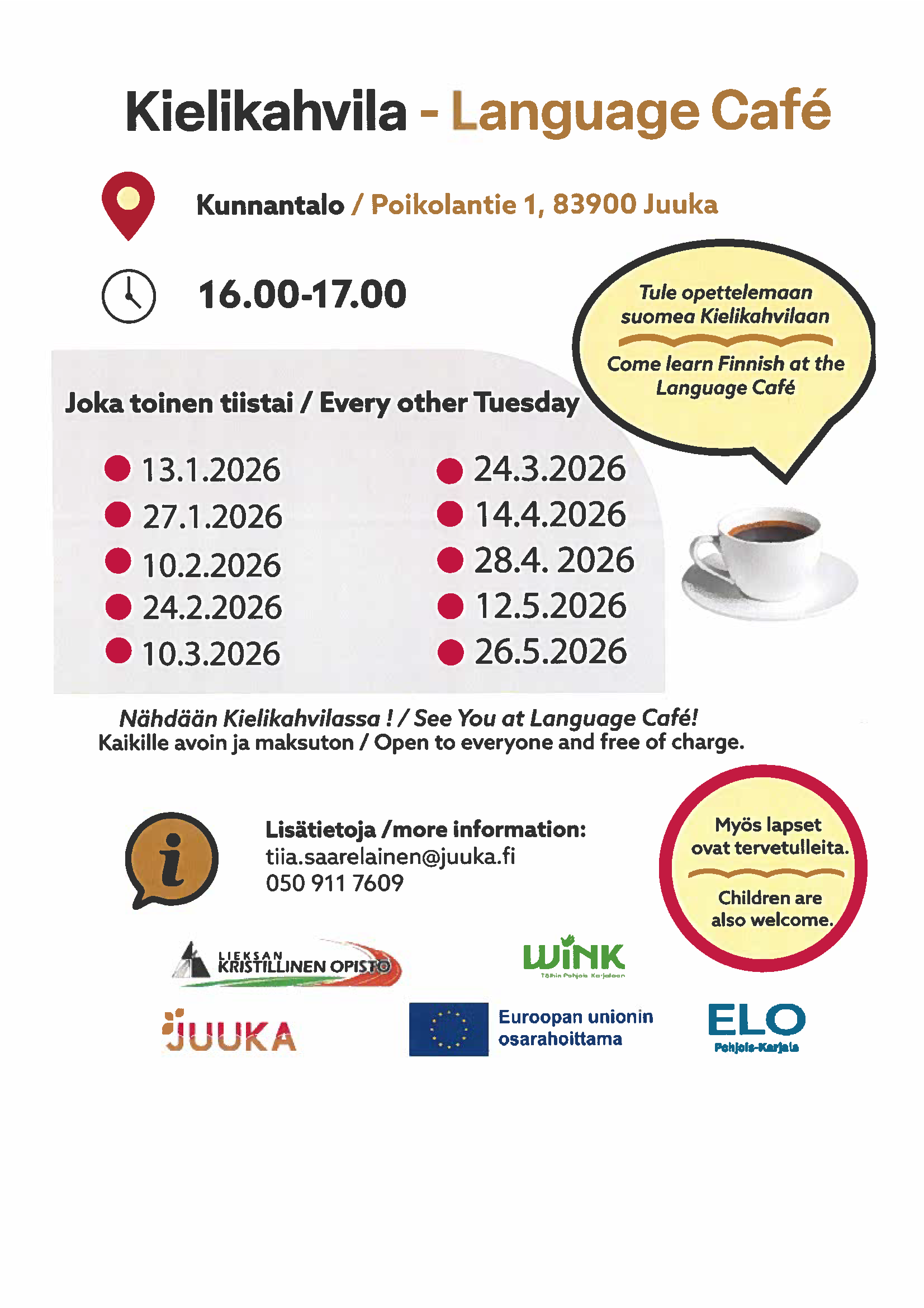 Kielikahvila on kaikille avoin rento tapahtuma, jossa voi opetella puhumaan suomea. Kielikahvilaan ovat tervetulleita kaiken tasoiset puhujat. Sujuva kielitaito ei ole vaatimus vaan myös aloittelijat ovat tervetulleita. Vapaamuotoisen keskustelun ja pelien avulla pääset myös tutustumaan helposti uusiin ihmisiin. Tapahtuma on maksuton ja myös lapset ovat tervetulleita! Osoite: Kunnantalo (Poikolantie 1, 83900 Juuka) Lisätiedot tiia.saarelainen@juuka.fi tai […]