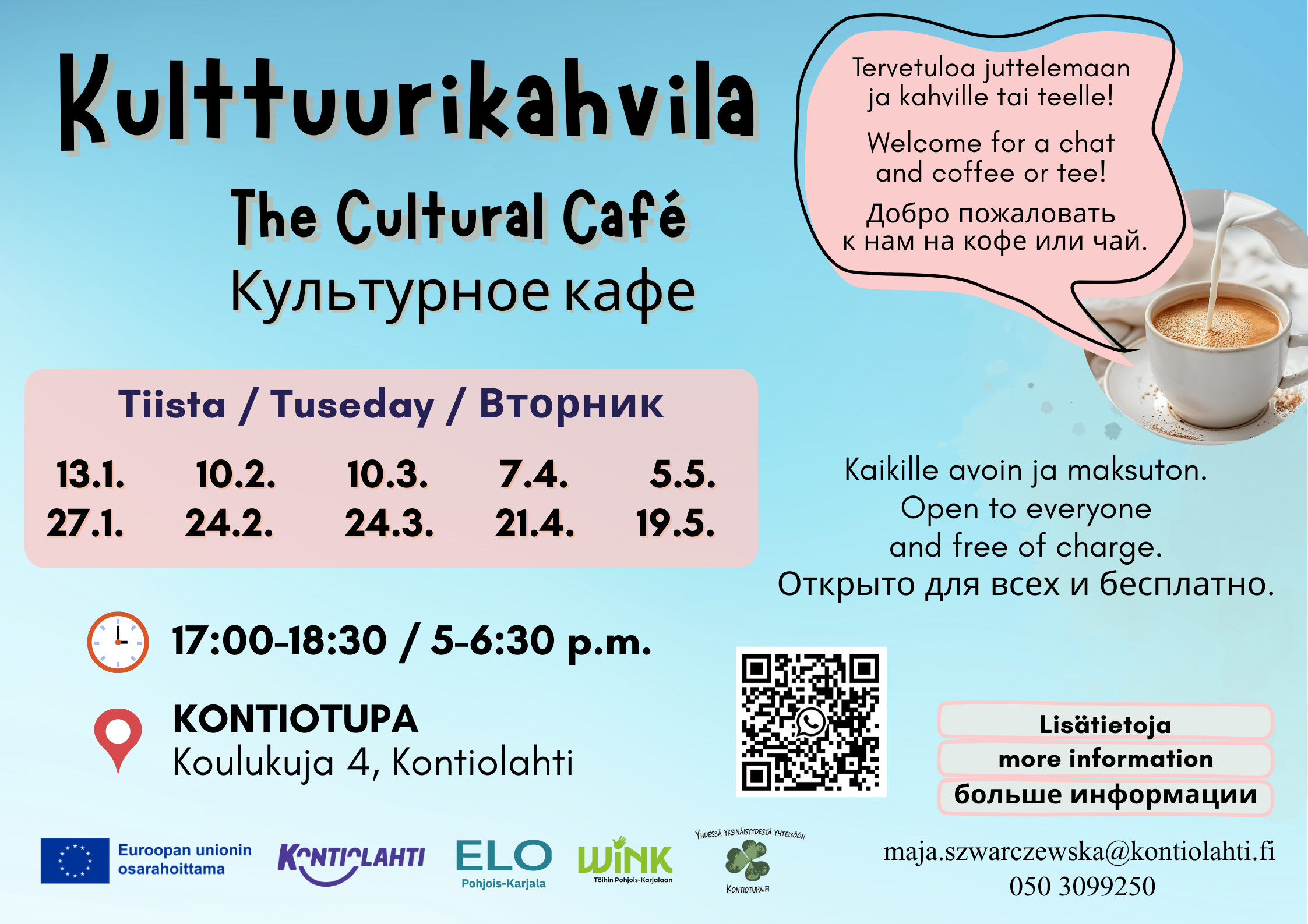 Tervetuloa kulttuurikahvilaan Kontiotuvalle tiistaina klo 17.00–18.30 (Koulukuja 4, Kontiolahti). Kulttuurikahvila on kaikille avoin ja maksuton kohtaamispaikka, jossa harjoitellaan suomen kieltä rennossa ilmapiirissä ja tutustutaan suomalaiseen sekä eri maiden kulttuuriin. Mukaan voi tulla kuka tahansa, kielitaidosta riippumatta – tekemällä ja yhdessä harjoittelemalla oppii. Tule viettämään mukavaa iltaa ja tapaamaan uusia ystäviä! Lisätiedot: Maja Szwarczewska, puh. 050 […]
