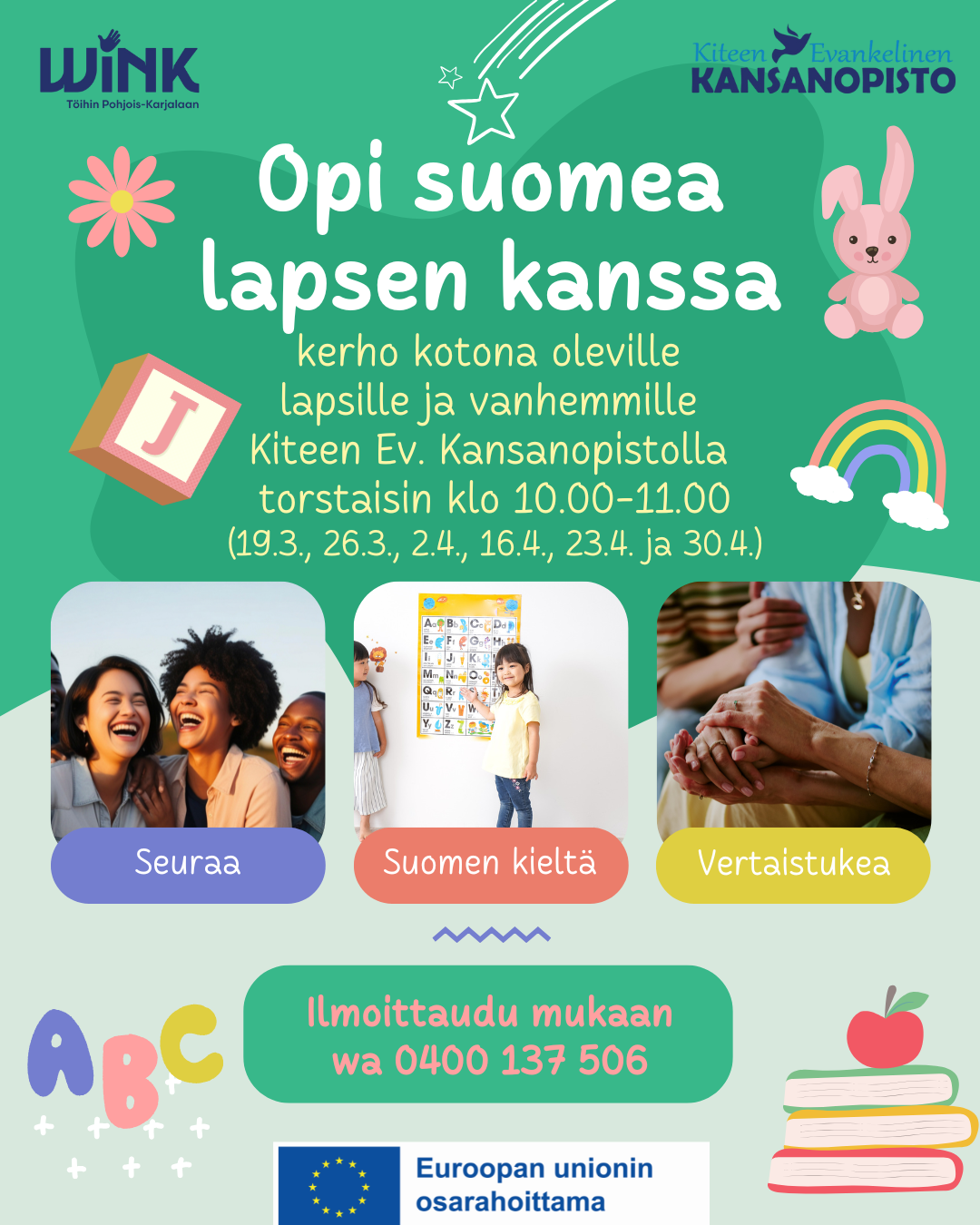 Opi suomea lapsen kanssa Kerho kotona oleville lapsille ja vanhemmille Tervetuloa mukaan lämminhenkiseen kerhoon, jossa opitaan suomen kieltä yhdessä lapsen kanssa. Kerho on tarkoitettu kotona oleville lapsille ja vanhemmille. Toiminta on rentoa ja lapsiystävällistä. Kerhossa: - harjoitellaan suomen kieltä - ollaan yhdessä ja saadaan seuraa - saadaan vertaistukea vanhemmille Paikka: Kiteen Evankelinen Kansanopisto Aika: torstaisin […]