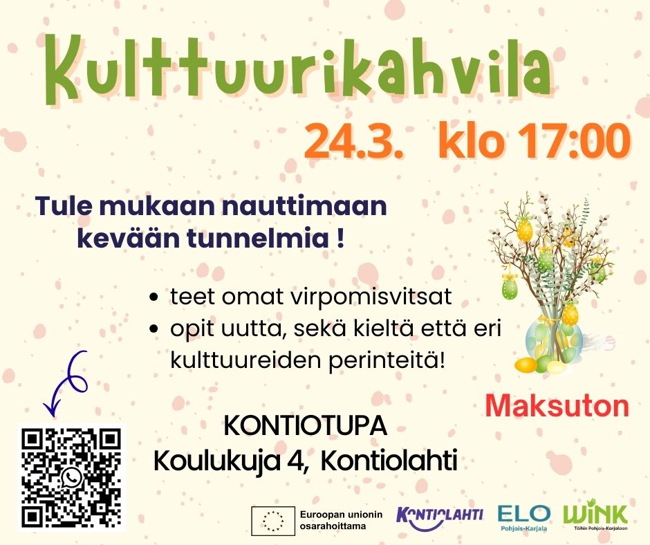 Tervetuloa 24.3. Kulttuurikahvilaan nauttimaan kevään ja pääsiäisen tunnelmia! Ensi viikolla keskustelemme mm. pääsiäisen perinteistä eri kulttuurien näkökulmasta ja pääsemme tekemään omat virpomisvitsat. Koristelemme yhdessä pajunoksat ja samalla mietimme, mitä virpominen Suomessa tarkoittaa ja millaisia toivotuksia ja loruja perinteisesti esitetään. Tule mukaan – täällä on helppo oppia uutta, sekä kieltä että eri kulttuureiden perinteitä! Tapahtuma on […]