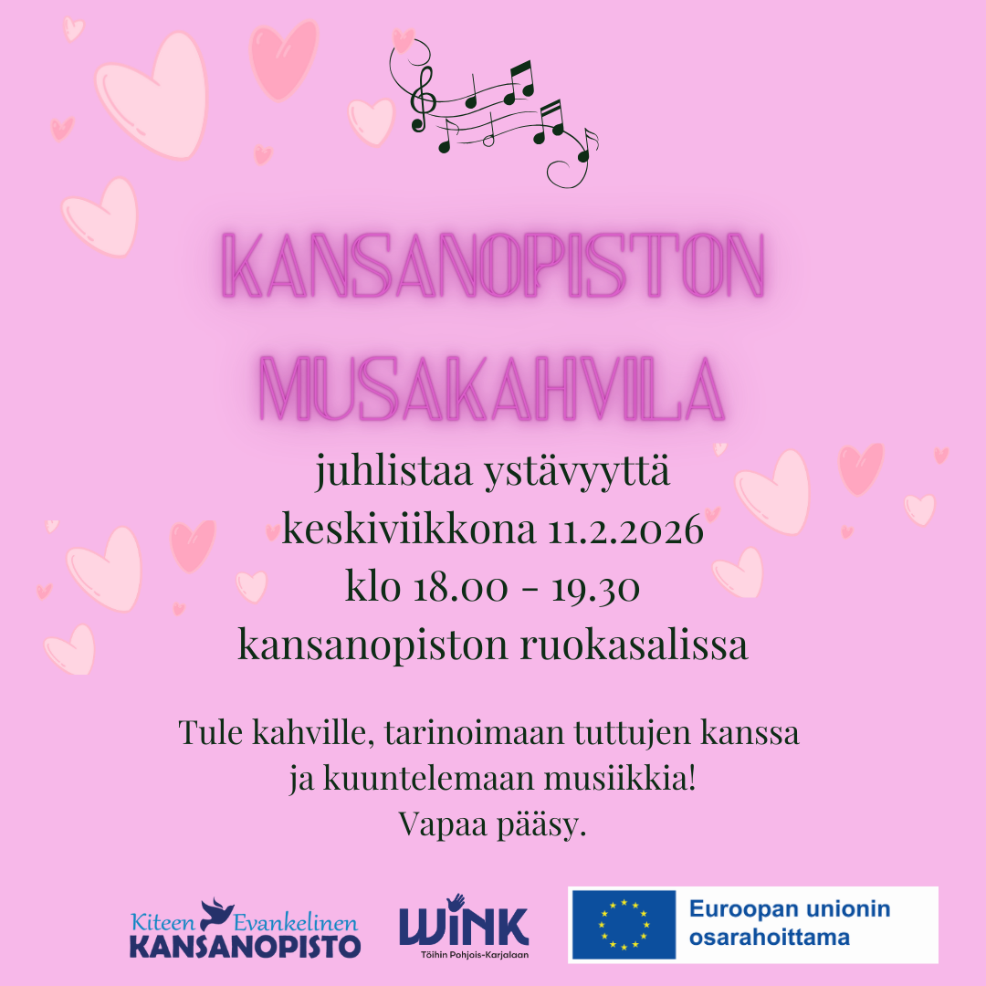 Kansanopiston Musakahvila juhlistaa ystävyyttä keskiviikkona 11.2.2026 klo 18.00–19.30 Kansanopiston ruokasalissa. Illan aikana kokoonnumme rennosti kahvikupin äärelle, juttelemme tuttujen kanssa ja nautimme musiikista. Musakahvila on lämminhenkinen kohtaamispaikka, jossa musiikki, tarinat ja yhdessäolo ovat pääosassa. Vapaa pääsy – tervetuloa mukaan! 📍 Paikka: Kansanopiston ruokasali 🕕 Aika: ke 11.2.2026 klo 18.00–19.30 Music Café The Folk High School Music […]