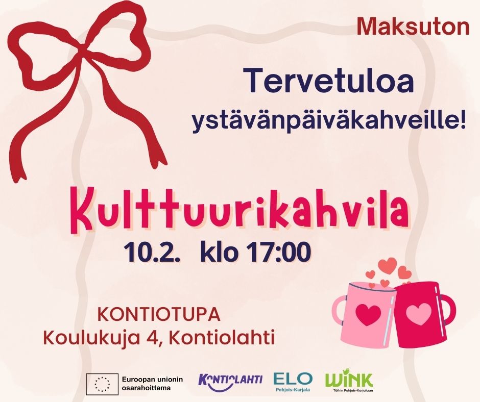 Tervetuloa ystävänpäiväkahveille Kulttuurikahvilaan! Monissa maissa ystävänpäivä liittyy romanttiseen rakkauteen, mutta Suomessa päivä keskittyy erityisesti ystävyyteen. Silloin muistetaan ystäviä, kavereita ja läheisiä ihmisiä. Monet lähettävät kortteja, viestejä tai antavat pieniä lahjoja. Voit askarrella kortteja, juoda kahvia tai teetä tai vain kuunnella oneonetwo päivästä (11.2.). Mutta mikä se on? Tämä selviää ensi tiistaina. Ota perhe, ystävät ja […]