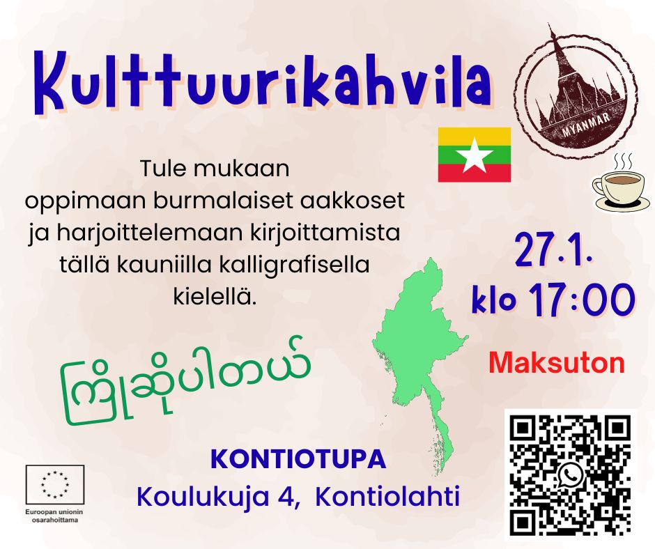 Tiesitkö, että maailmassa puhutaan yli 7 000 kieltä? Mitä kieliä sinä puhut? Tulethan tutustumaan eri maiden kieliin Kulttuurikahvilaan! Ensi tiistaina 27.1. Kontiotuvalla opiskellaan burman kieltä, jota puhutaan Myanmarissa. Opitaan burmalaiset aakkoset ja harjoitellaan kirjoittamista tällä kauniilla kalligrafisella kielellä. Kuunnellaan myös musiikkia Kaakkois-Aasian maailmankolkalta. Ehkä sinä voisit myös opettaa meille vähän jotain kieltä? Tervetuloa rohkeasti 27.1. […]