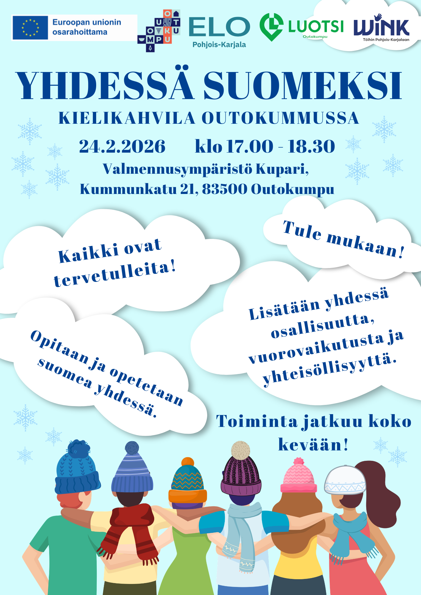 ❄️ Yhdessä suomeksi – Kielikahvila Outokummussa Tule harjoittelemaan suomen kieltä rennossa ja mukavassa ilmapiirissä. 📅 24.2.2026 ⏰ klo 17.00–18.30 📍 Valmennusympäristö Kupari Kummunkatu 21, 83500 Outokumpu Kielikahvilassa: • Puhutaan suomea • Tavataan uusia ihmisiä • Opitaan yhdessä Kaikki ovat tervetulleita! Toiminta jatkuu koko kevään. 💬 Tule mukaan! *****************'' ❄️ Together in Finnish – Language Café […]