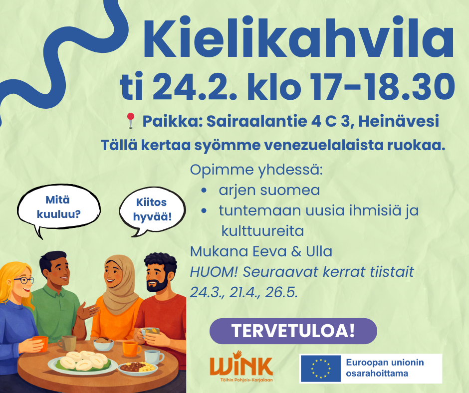 ☕ Kielikahvila Heinävedellä Tervetuloa kielikahvilaan! Tule juttelemaan, syömään ja oppimaan suomea yhdessä. 📅 Tiistaina 24.2. klo 17–18.30 📍 Paikka: Sairaalantie 4 C 3, Heinävesi 🍽️ Tällä kertaa syömme venezuelalaista ruokaa. Kielikahvilassa: • puhumme arjen suomea • tutustumme uusiin ihmisiin • opimme eri kulttuureista Mukana Eeva ja Ulla 💙 🔔 Seuraavat kerrat tiistaisin: 24.3., 21.4. ja […]