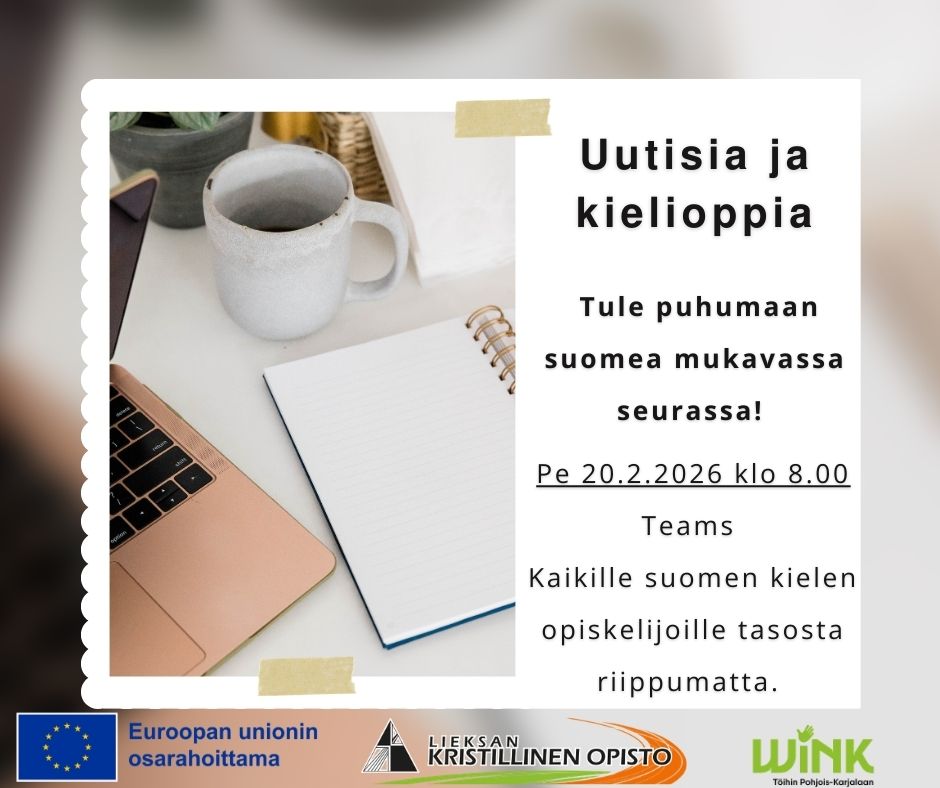 Kielikahvila verkossa: Uutisia & kielioppia Liity rentoon kielikahvilaan, jossa harjoittelemme suomea ajankohtaisten uutisten avulla. Pe 20.2. klo 8-9 Teams Keskustelemme uutisista, harjoittelemme sanastoa ja kielioppia Kaikille suomen kielen opiskelijoille tasosta riippumatta. Ei ilmoittautumista ennakkoon. ☕ Ota kahvia ja tule puhumaan suomea mukavassa seurassa! Teams-linkki: https://teams.microsoft.com/meet/38335016198879?p=TPzYZ7xOi1k5tfzkOu
