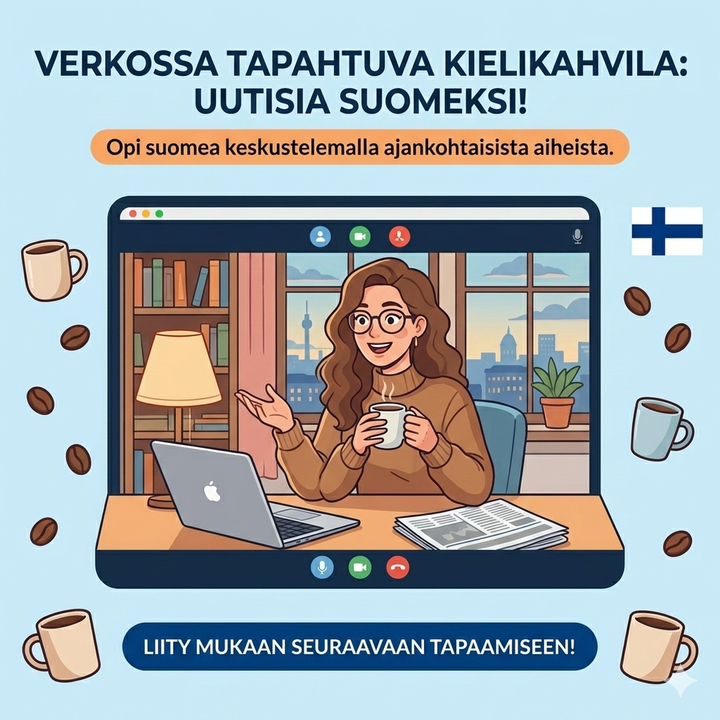 Uutiskielikahvila verkossa: Liity rentoon kielikahvilaan, jossa harjoittelemme suomea ajankohtaisten uutisten avulla. Teams: Pe 27.2. klo 8.00 Pe 13.3. klo 8.00 Pe 20.3. klo 8.00 Pe 27.3. klo 8.00 Keskustelemme uutisista, harjoittelemme sanastoa ja kielioppia. Kaikille suomen kielen opiskelijoille tasosta riippumatta. Ei ilmoittautumista ennakkoon. ☕ Ota kahvia ja tule puhumaan suomea mukavassa seurassa! Teams-linkki: https://teams.microsoft.com/meet/35940243691769?p=2VX8MhFvSYVQCHP6Rl