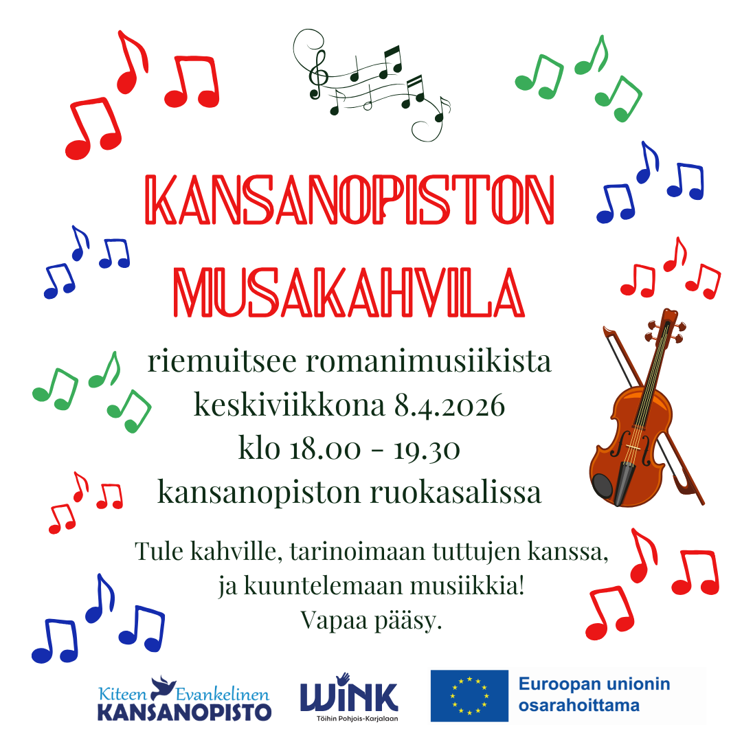 🎶 Kansanopiston musakahvila 🎶 Tervetuloa viettämään rentoa iltaa musiikin parissa! 💛 Tällä kertaa nautitaan romanimusiikin tunnelmista ✨ 📅 Keskiviikkona 8.4.2026 🕕 klo 18.00–19.30 📍 Kansanopiston ruokasalissa Tule kahville, tapaamaan tuttuja ja kuuntelemaan musiikkia ☕🎻 Vapaa pääsy! ********************* 🎶 Folk High School Music Café 🎶 Welcome to enjoy a relaxed evening with music! 💛 This time […]